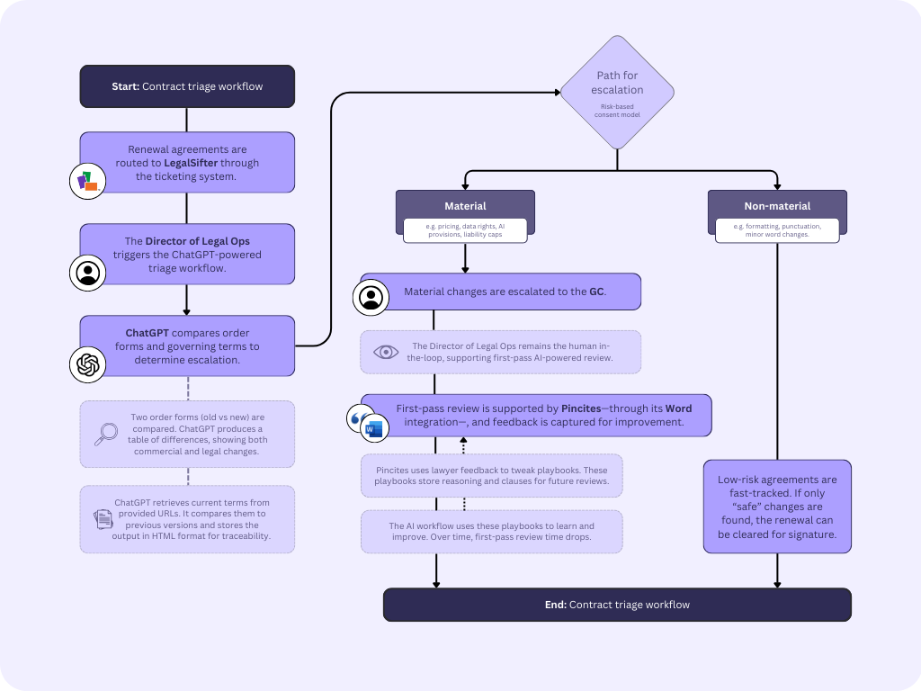 Together, these tools automated low-risk vendor renewals, flagged meaningful changes, and routed only the riskiest ones to the legal team for first-pass review.
